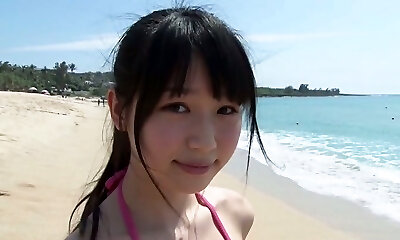 Slim Japanese girl Tsukasa Arai ambles on a sandy beach under the sun