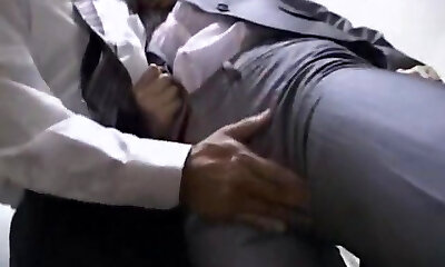 Japanese office damsel gives a blowjob to some stud in a public place